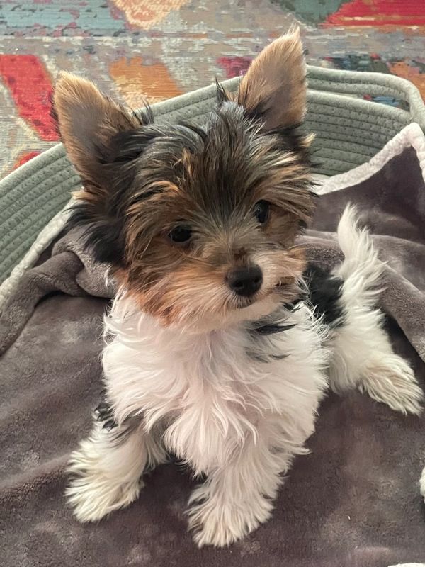Eve is a purebred Sable Parti Yorkie. Eve weights 10 lbs., has a soft, wavy coat and a very loving and playful temperament.